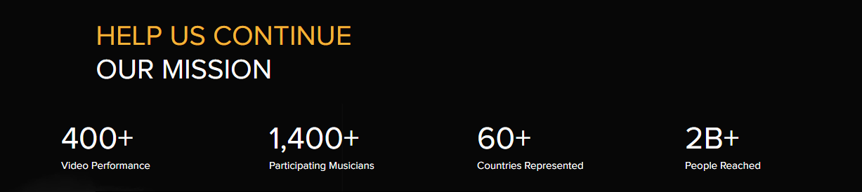 To date we have produced nearly 400 videos, recorded over 1,400 musicians in 60+ countries and touched the hearts of over two billion viewers, and none of this would have been possible without our loyal supporters.