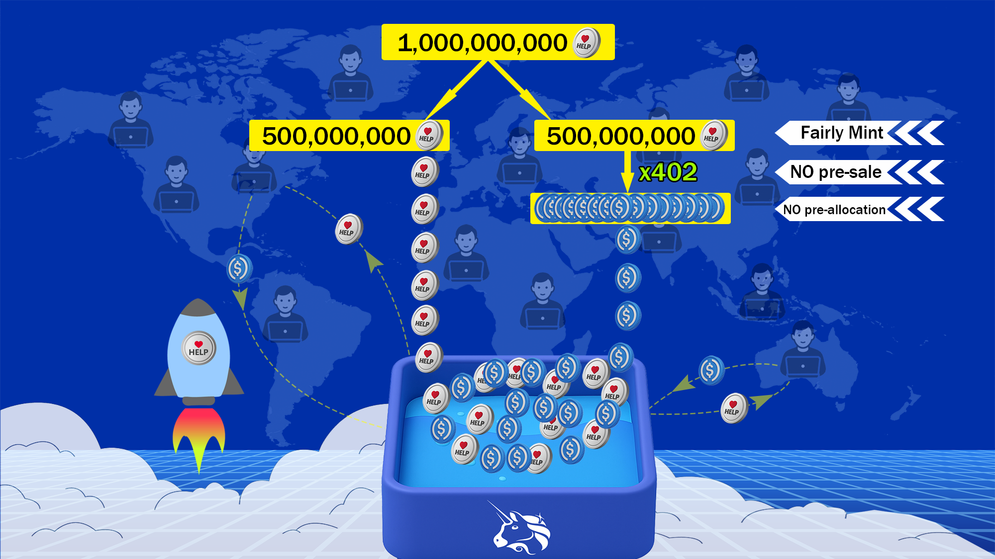 The total USDC raised from minting these 500 million help tokens serve as the initial liquidity capital, which, together with the initial liquidity supply 500 million help tokens, are both injected into the uniswap liquidity pool to establish the trading and exchange mechanism.