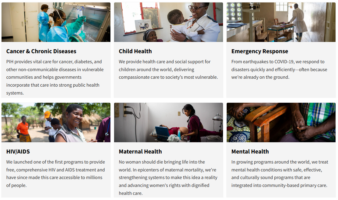 Partners In Health collaborates with national governments to provide care and strengthen public health systems in areas including cancer and chronic disease, child health, emergency response, HIV/AIDS, maternal health, mental health, and tuberculosis.